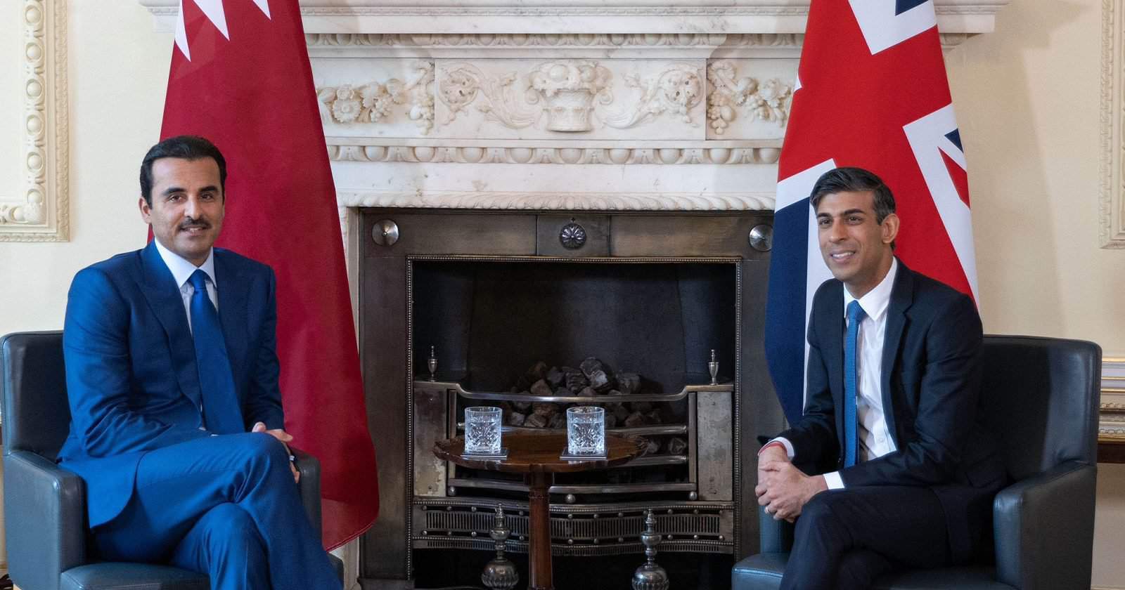 ووفقاً للفيديو المتداول، فإنه ما إن جلس الزعيمان على الكراسي المخصصة لهما في مبنى رئاسة الوزراء البريطانية حتى قام “سوناك” بوضع “رجل على رجل” موجّهاً قدمه اليسرى نحو أمير قطر، ليقوم الشيخ تميم على الفور بوضع رجله اليمنى على اليسرى موجّهاً قدمه نحو “سوناك”.