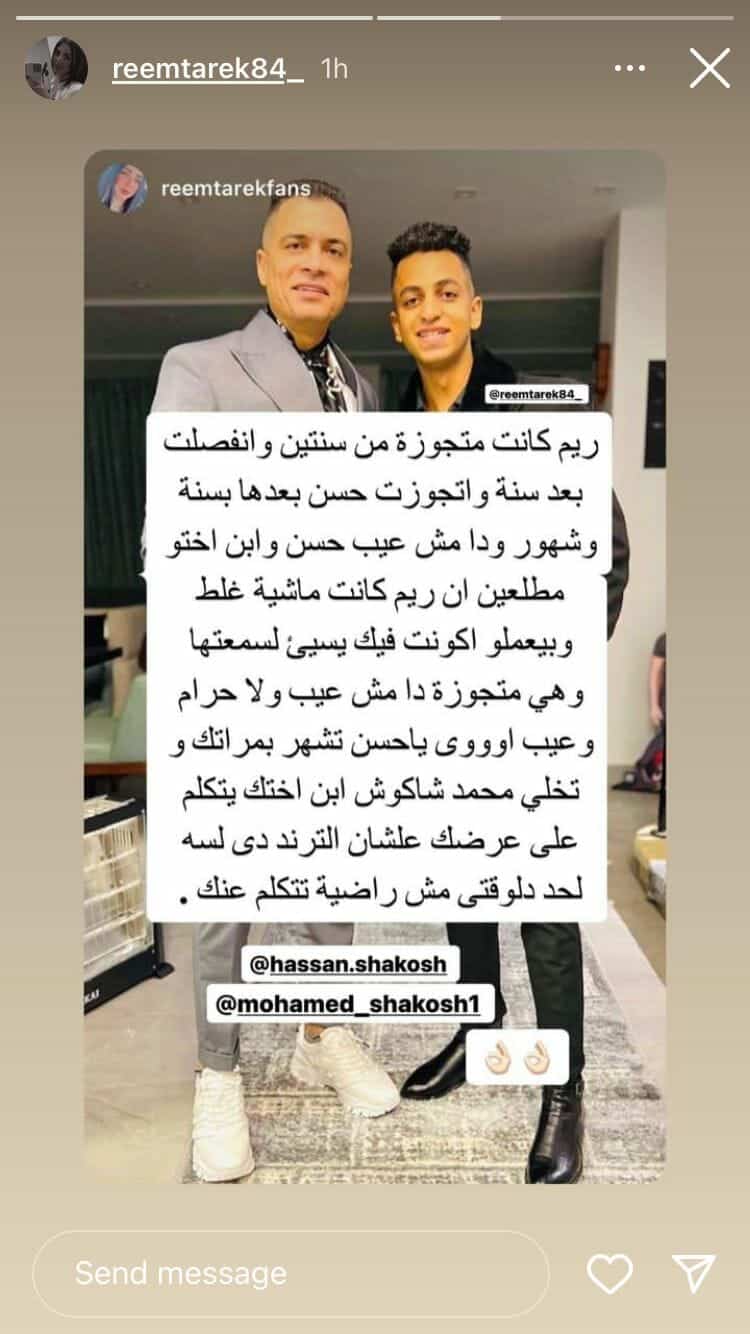 من جهتها، ردّت ريم طارق على صورة زواجها السابق، بإعادة نشر صورة عبر خاصية الستوري كُتب عليها: “ريم كانت متجوزة من سنتين وانفصلت بعد سنة.. واتجوزت حسن بعدها بسنة وشهور ودا مش عيب”.