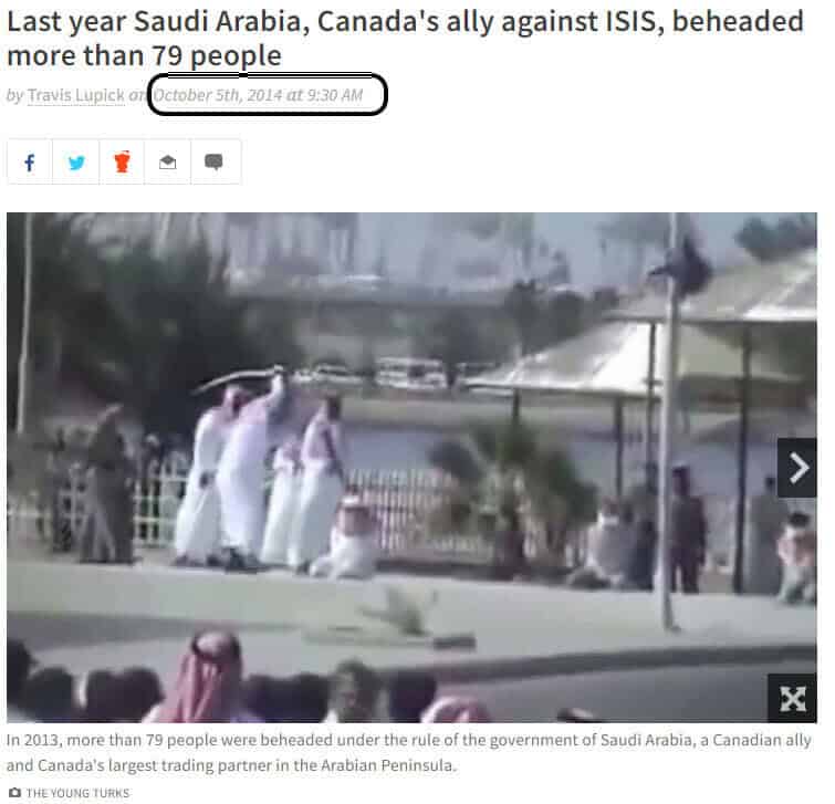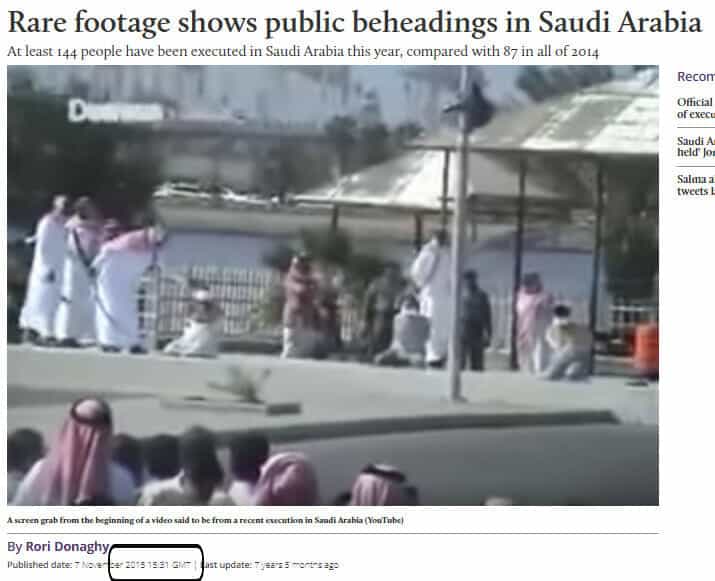 كما لفت الموقع إلى أن المقطع أعيد تداوله بكثرة عام 2015، وقيل إنه يظهر قيام السلطات السعودية بقطع رؤوس عدد من الرجال علنًا في ساحة عامة، وجاء حينها ضمن تقارير تتحدث عن ارتفاع عدد الإعدامات في المملكة العربية السعودية بشكل كبير خلال 2015 مقارنة بعام 2014، وفقًا لمنظمة هيومن رايتس ووتش.