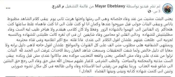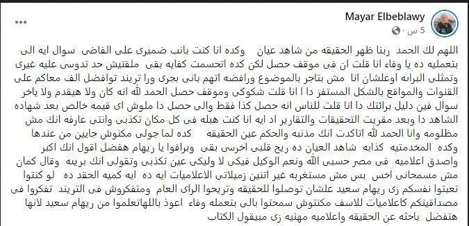 واختتمت ميار الببلاوي: “سبحان الله مش حق وفاء اللي رجع، حق البنتين اللي شافو قمة العذاب.. وربنا يفكهم من رقبتي إنما الأستاذة وفاء واللي طالعة في كل مكان تشوه صورتي، وتبين إني كتمت شهادة كذابة وبيني وبينها القضاء العادل”.