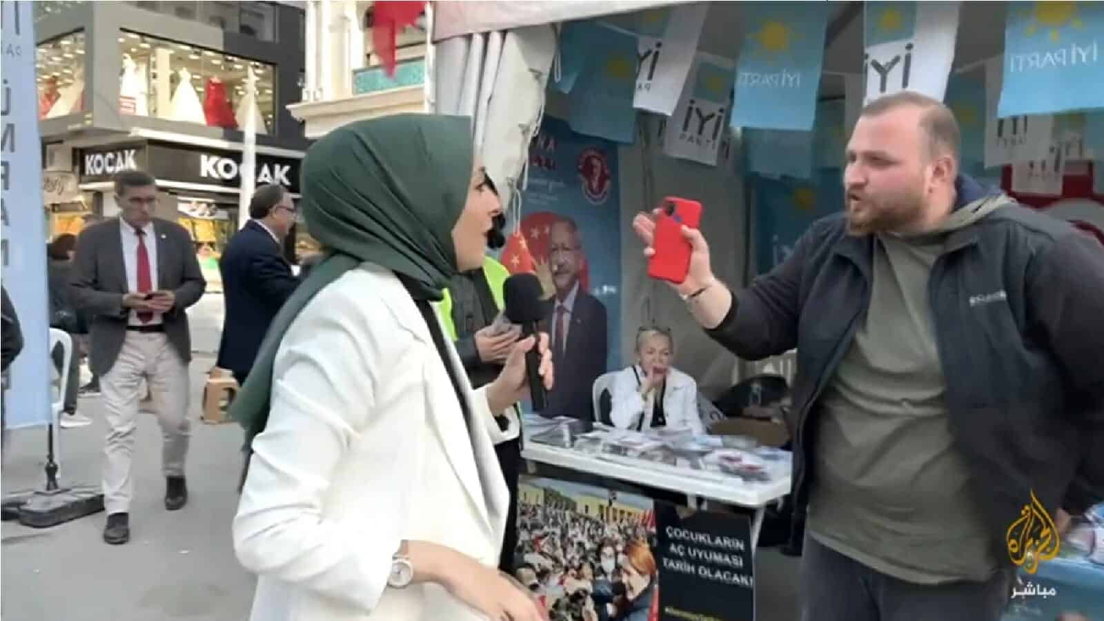 الاعتداء على مراسلة الجزيرة مباشر من حملة حزب معارض أثناء تغطية الانتخابات التركية#الجزيرة_مباشر | #تركيا 🇹🇷 pic.twitter.com/LxAmo9Or0N
