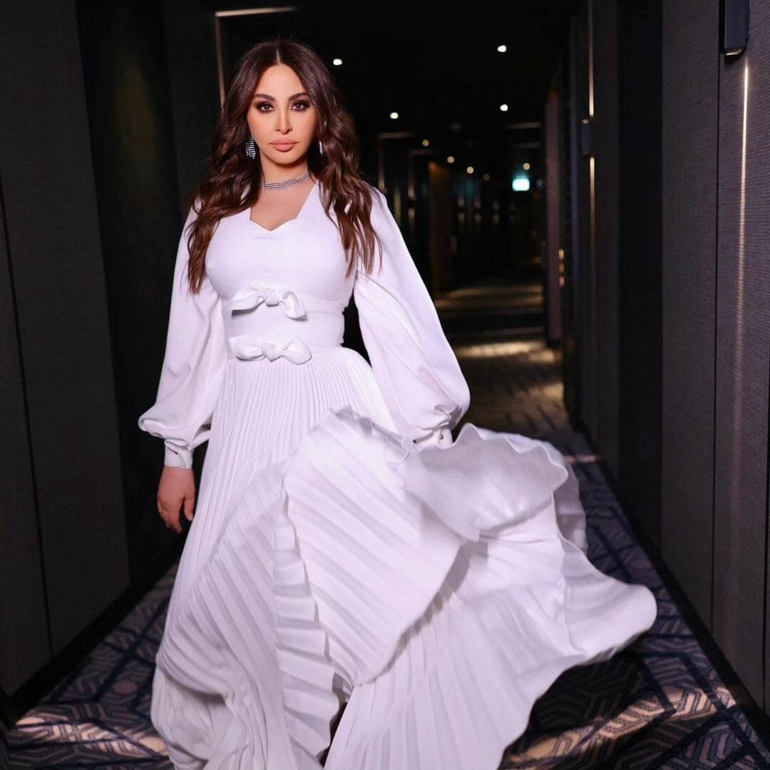 وأطلت إليسا في حفلها بالكويت، بفستان أبيض حرير من تصميم إيلي صعب. تميَّز بأكمامه الفضفاضة وتنورته المزينة بكسرات رفيعة. في حين جاء بربطتين على شكل “فيونكة” زينت خصرها وأسفل صدرها.