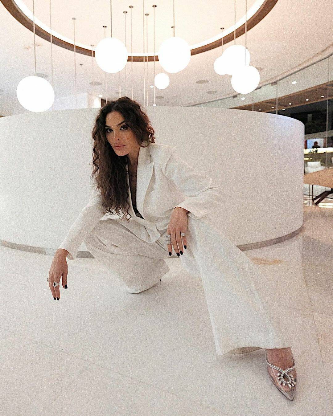 وارتدت نادين نجيم في الصور التي نشرتها عبر “انستجرام“، بدلة رسمية باللون الأبيض، تحتها حمالة صدر شفافة باللون الأسود.