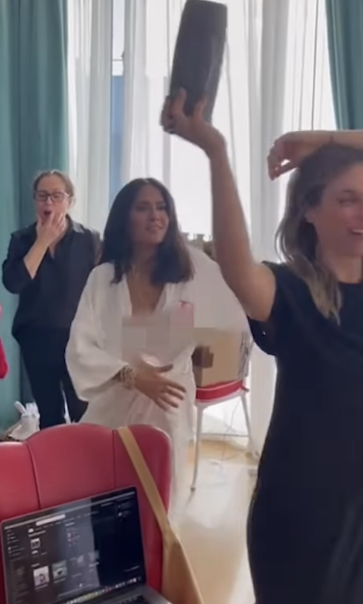 لكن سلمى حايك لم تكترث بأن روب الاستحمام الذي كانت ترقص به، انزلق وكشف عن أثدائها.