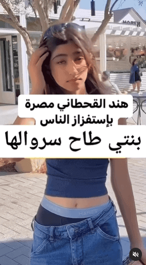 وحاولت ابنة هند القحطاني مداراة ذلك، حيث أمسكت ببناطلها محاولة رفعه وتغطية ملابسها الداخلية إلا انها لم تنجح في ذلك.