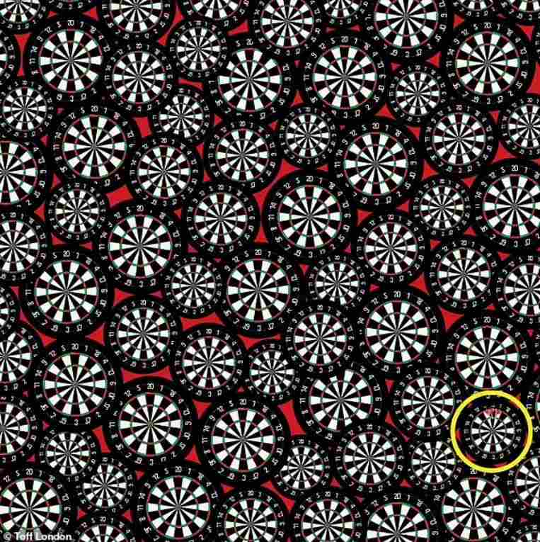 نشرت صحيفة إكسبرس البريطانية صورة فيها كثير من لوحات رمي السهام (المعروفة كذلك بلعبة دارتس)، والمطلوب منك اكتشاف ثلاثة مثلثات حمراء صغيرة في 15 ثانية فقط.