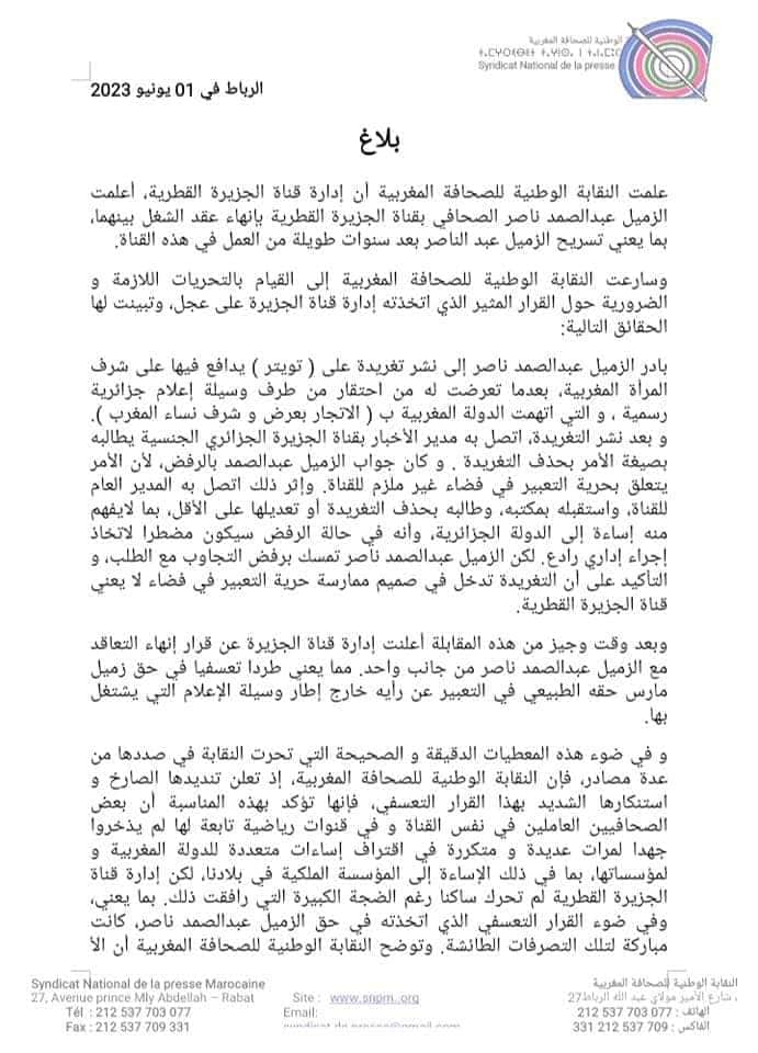 وجاء في بيان للنقابة المغربية، أنّ سبب إنهاء عمل عبد الصمد ناصر من قناة الجزيرة يعود لنشره تغريدة على تويتر، “يدافع فيها على شرف المرأة المغربية”، بعدما تعرضت له من “احتقار من طرف وسيلة إعلام جزائرية رسمية”، والتي اتهمت الدولة المغربية بـ”الاتجار بعرض وشرف نساء المغرب”. حسب البيان الذي قال إنه حصل على “معطيات دقيقة وصحيحة من مصادر عديدة”.