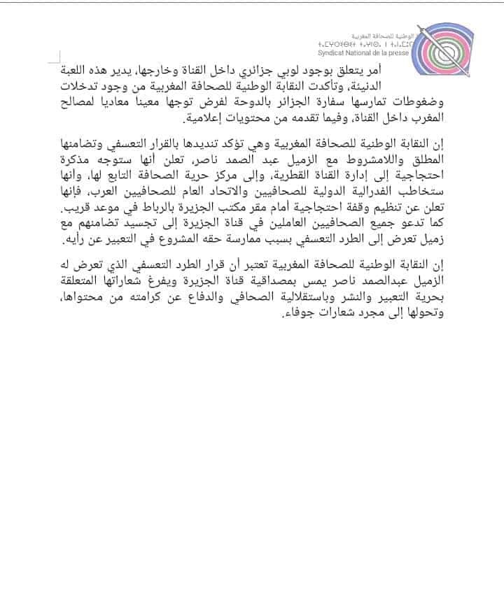 وزعمت النقابة وجود “لوبي جزائري” داخل القناة وخارجها، يدير ما وصفتها (اللعبة الدنيئة)، وادّعت وجود “تدخلات وضغوط تمارسها سفارة الجزائر بالدوحة لتفرض توجّهاً معيناً معادياً لمصالح المغرب داخل القناة، وفيما تقدّمه من محتويات إعلامية”.