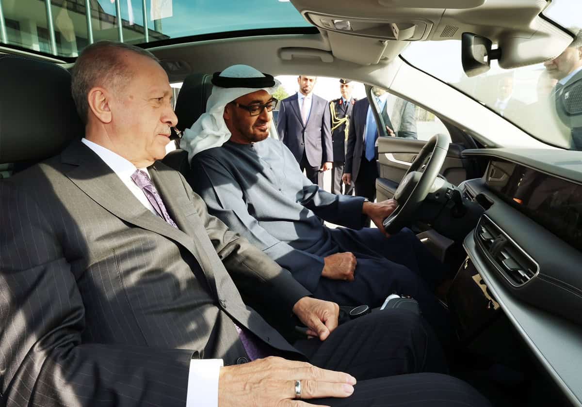 كما ظهر الرئيس الإماراتي وهو يخوض تجربة قيادة سيارة “توغ” التركية الكهربائية الجديدة، وكان يجلس إلى جانبه الرئيس التركي، في صور لاقت تفاعلاً كبيراً.