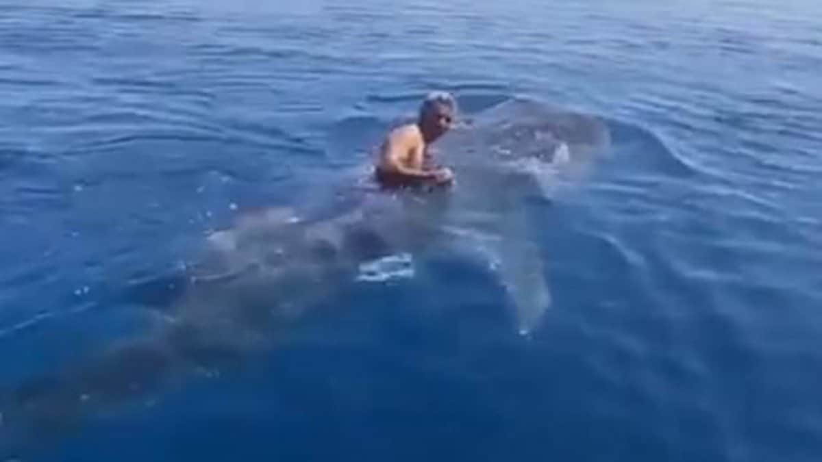 واستمر الشاب السعودي، نائماً على ظهر القرش وهو يسبح، لفترة طويلة، وكان لافتاً إلى القرش لم يُبدِ أيّ ردّ فعل.