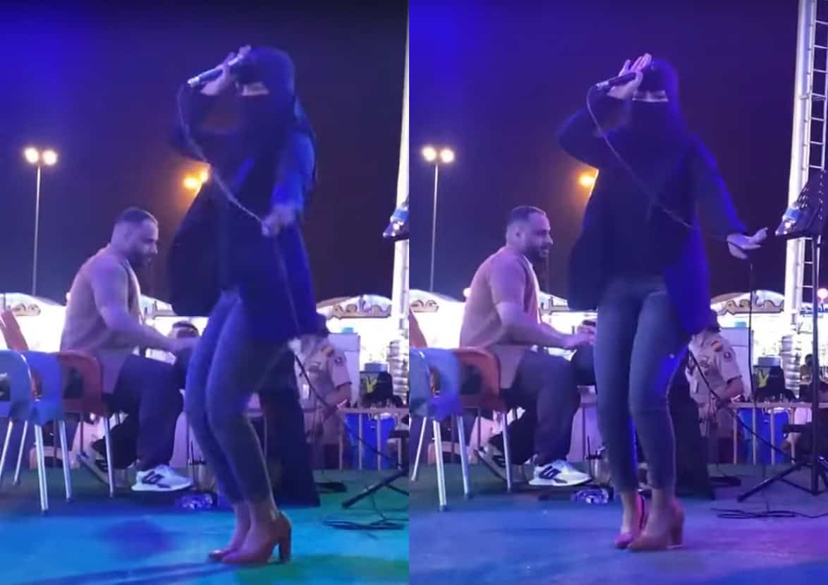 وفي مقاطع فيديو نشرها مغردون عبر تويتر، تظهر فتاة منقبة وترتدي بنطال جينز “سكيني”، وحذاءً ذا كعب، وكانت ترقص على أنغام الأغاني التي تؤديها.