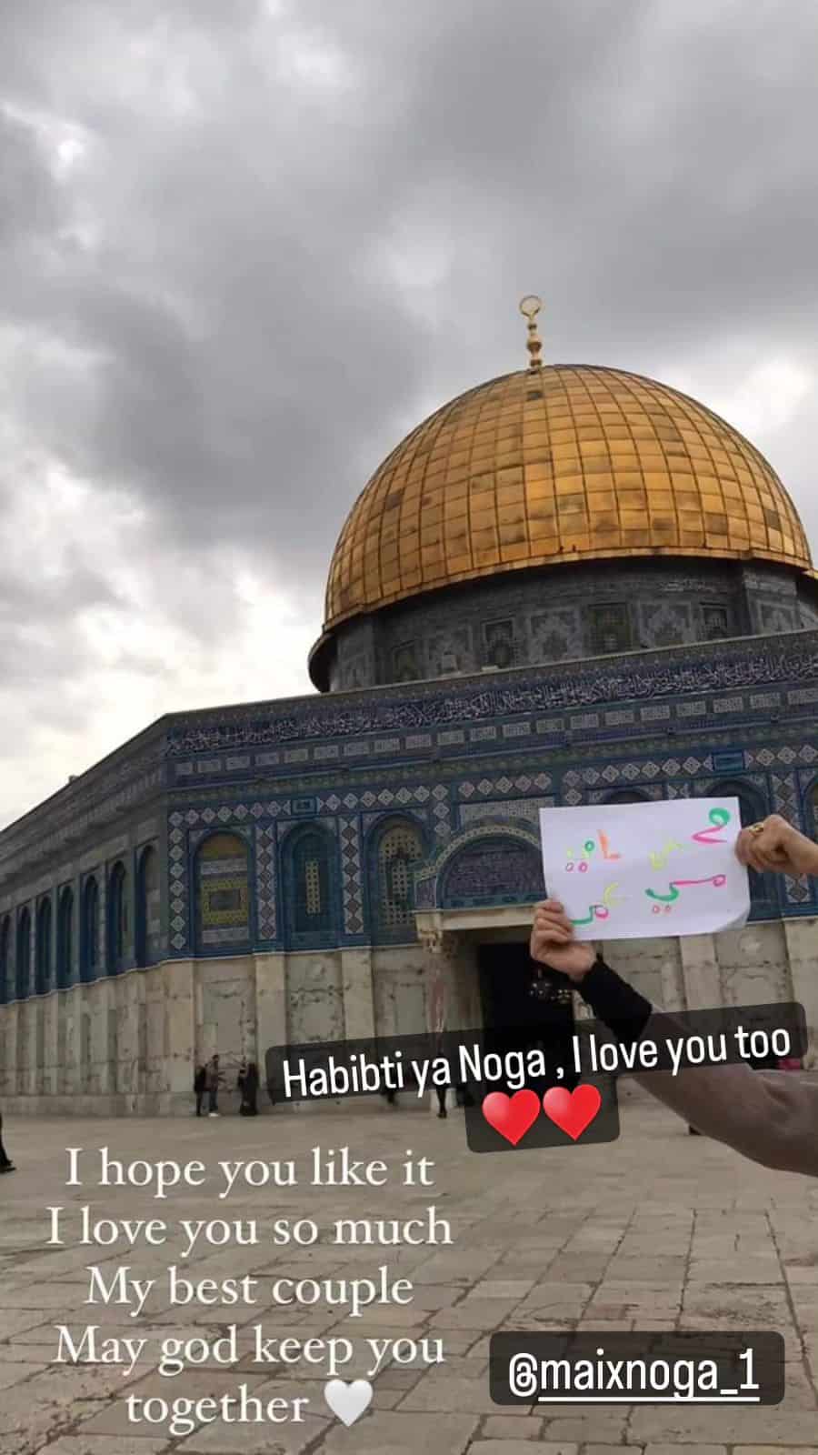 وكانت المعجبة ترفع ورقة عليها اسم مي عمر وزوجها المخرج محمد سامي أمام قبة الصخرة، معقًبةً: “أتمنى أن تعجبك.. أحبك جداً.. الثنائي المفضل لدي.. أتمنى من الله أن تبقوا معاً إلى الأبد”.
