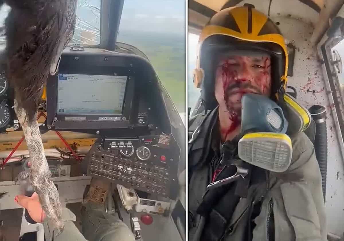 ووفقاً للفيديو الذي أعادت نشره صحيفة “ديلي ميل” البريطانية، فقد ظهر الطائر المصاب بجروح خطيرة وهو يتدلى فوق الطيار الذي ظهر وهو ملطّخ بالدماء في جميع أنحاء وجهه وبزيه العسكري، بينما يستمر في توجيه الطائرة دون أن يتحرك.