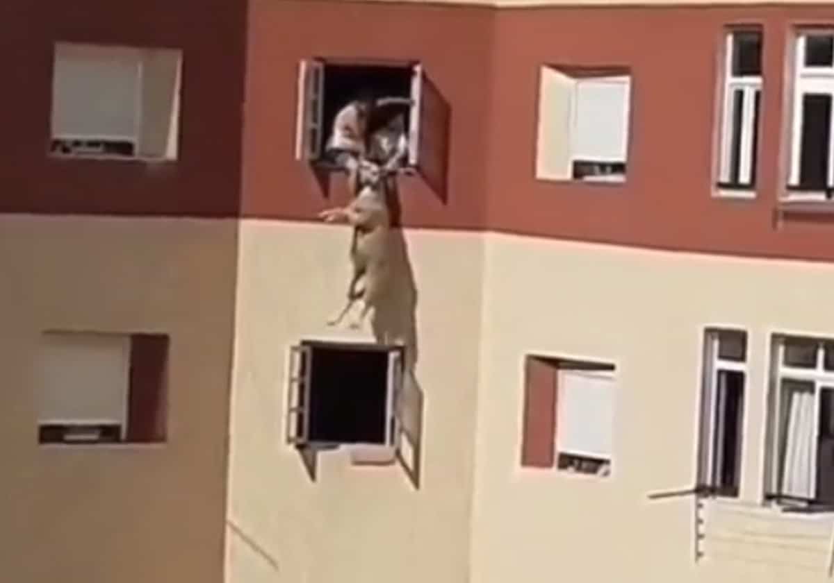 واضطر أحد الأشخاص إلى تسلق الواجهة الخارجية للمبنى في محاولة لإنقاذه، وبالفعل نجح في ذلك في النهاية ليتلقفه آخرون أسفل المبنى.