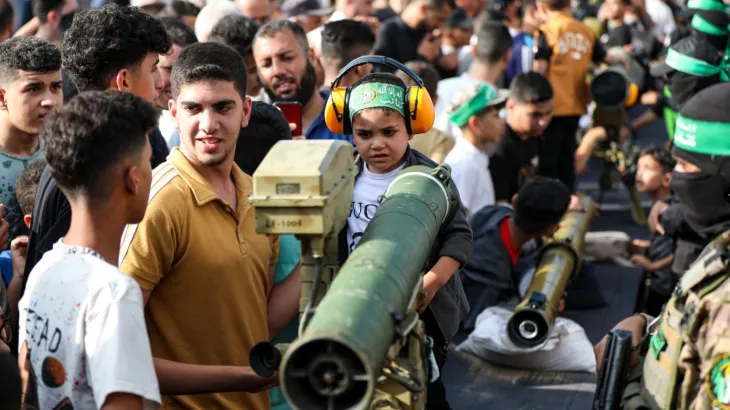 ابتسم فتى صغير يرتدي زيا عرييا و عصابة رأس خضراء للكتائب بينما كان رجل يسند قاذفة صواريخ على كتفه، وأمسك آخر بزمام التحكم بمدفع مضاد للطائرات بينما وقف شبان أمام عرض للصواريخ على منصات.