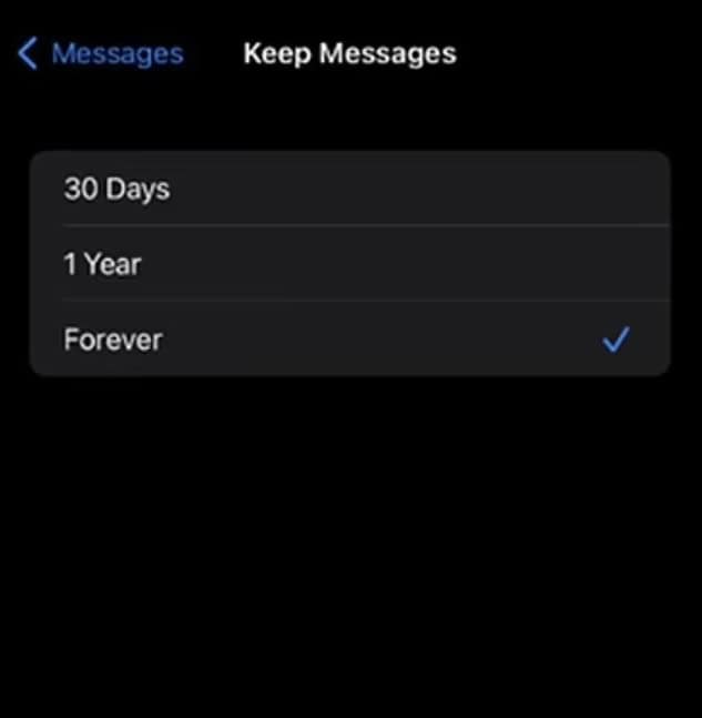 سيكون الإعداد على ‘إلى الأبد’ تلقائيًا، لكن يمكنك اختيار ما يناسبك. إذا ضغطت على أحد الخيارات، ستتلقى رسالة تفيد بما إذا كنت ترغب في حذف الرسائل الأقدم.