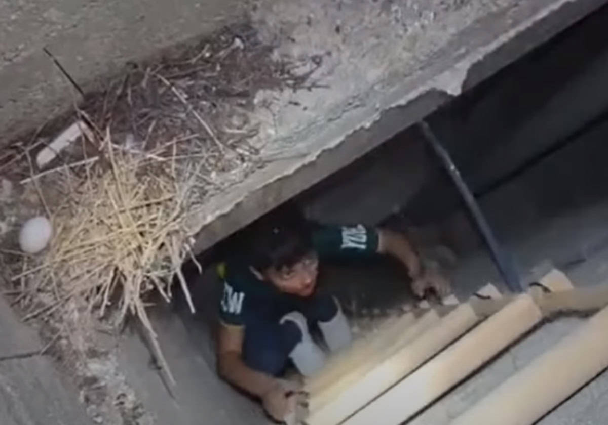 وأظهر مقطع الفيديو المتداول، أن الطفل أراد إنقاذ عش عصفور عالق في منور البناء.