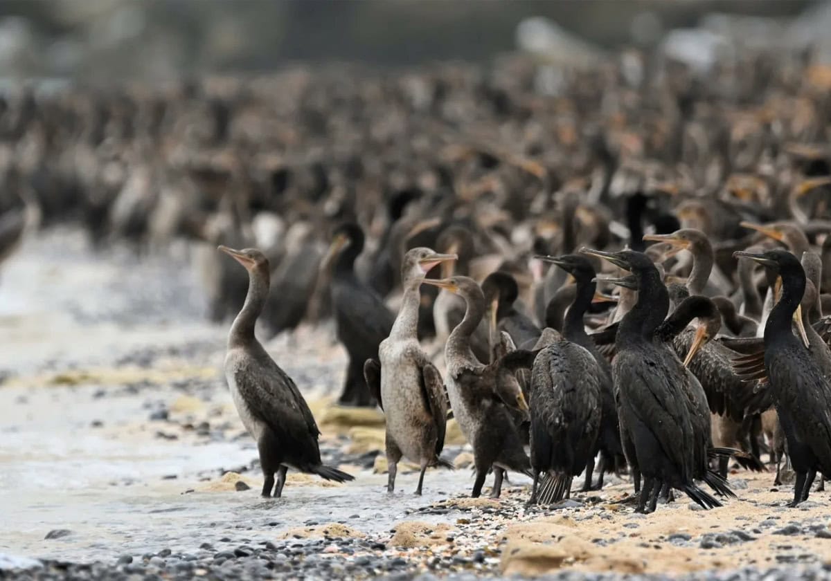 وفي الصور المنشورة بدت عشرات الطيور الأخرى على سطح البحر، ووثقت صورة أخرى التقطت من قرب عدداً من طيور الغاق وهي تقف رافعة رؤوسها إلى الأعلى.