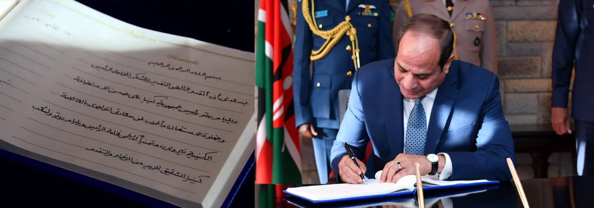 وطن – أثارت صورة لرسالة كتبها الرئيس المصري، عبدالفتاح السيسي، في كتاب سجل الزائرين في كينيا عند وصوله للمشاركة بالقمة التنسيقية للاتحاد الأفريقي، تفاعلاً واسعاً عبر مواقع التواصل الاجتماعي.