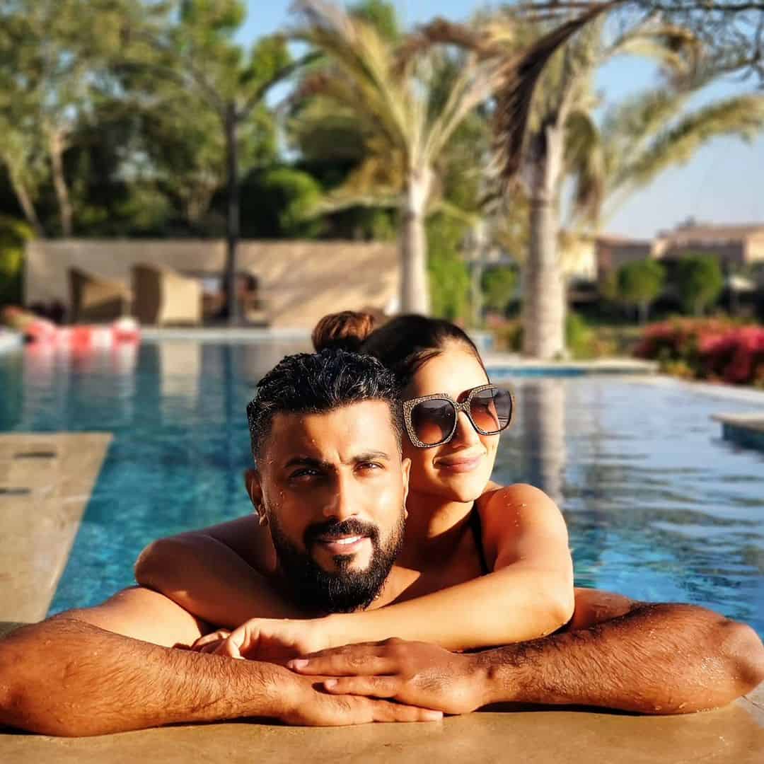 محمد سامي ومي عمر في وضع حميمي بملابس البحر في حمام السباحة (شاهد)