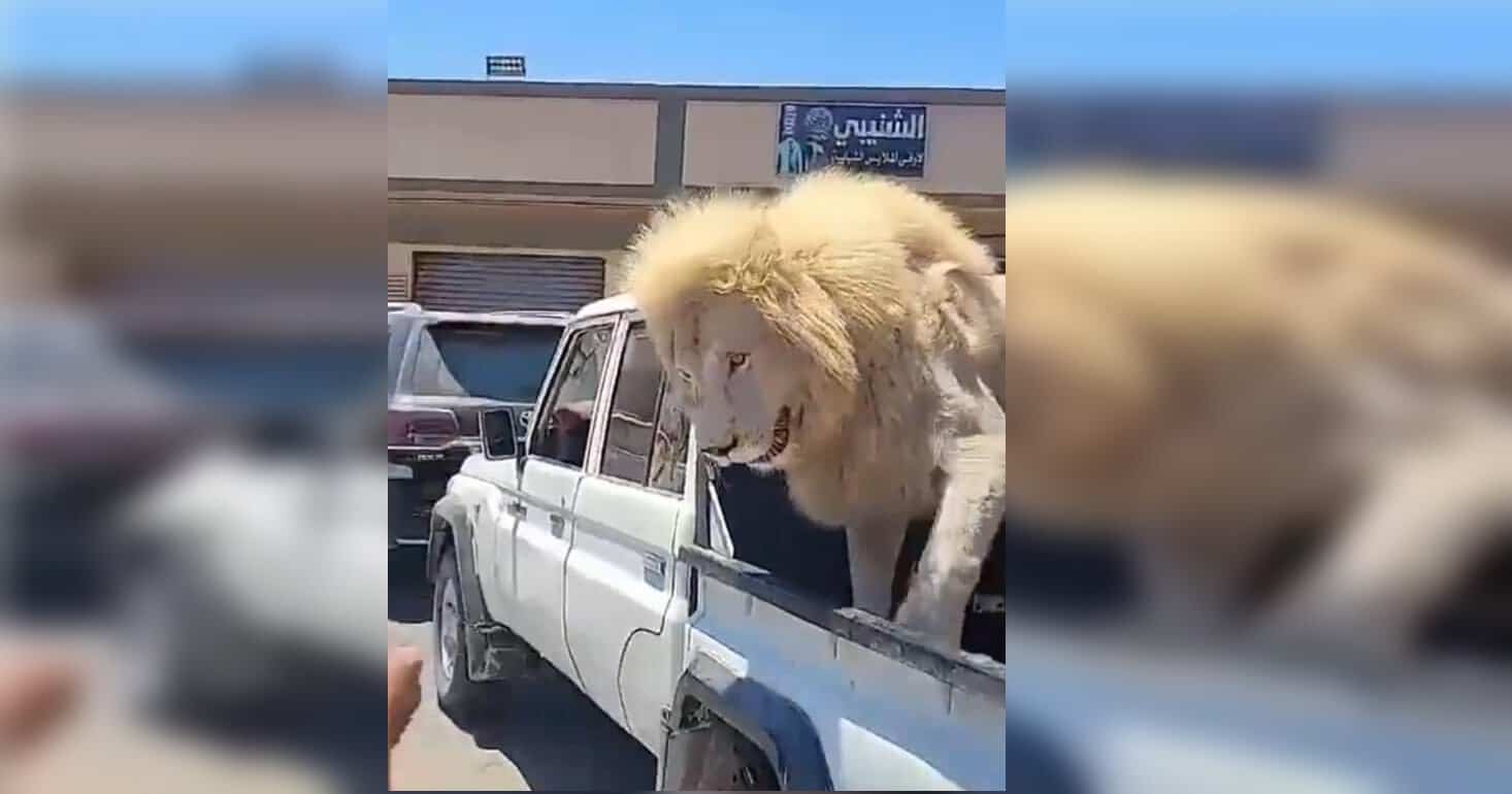 أسد مربوط على متن سيارة نصف نقل في #ليبيا دون حماية يثير الجدل pic.twitter.com/0SPTxVRioY