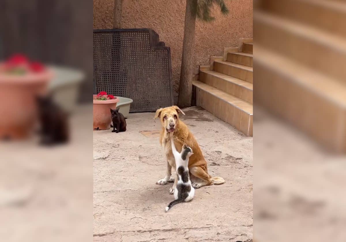 حيث رصدت عدسات الكاميرا هذا المشهد المؤثر، الذي وثّق لقطة للقطة وهي تُدلّك كلباً أعمى، لا يتحرك كثيراً بسبب إعاقته.