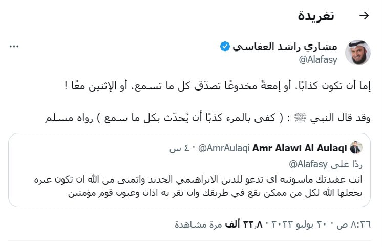 وقال العفاسي في معرض ردّه على المغرد: “إما أن تكون كذابًا، أو إمعةً مخدوعًا تصدّق كل ما تسمع، أو الإثنين معًا !. وقد قال النبي ﷺ : ( كفى بالمرء كذبًا أن يُحدّث بكل ما سمع ) رواه مسلم”.