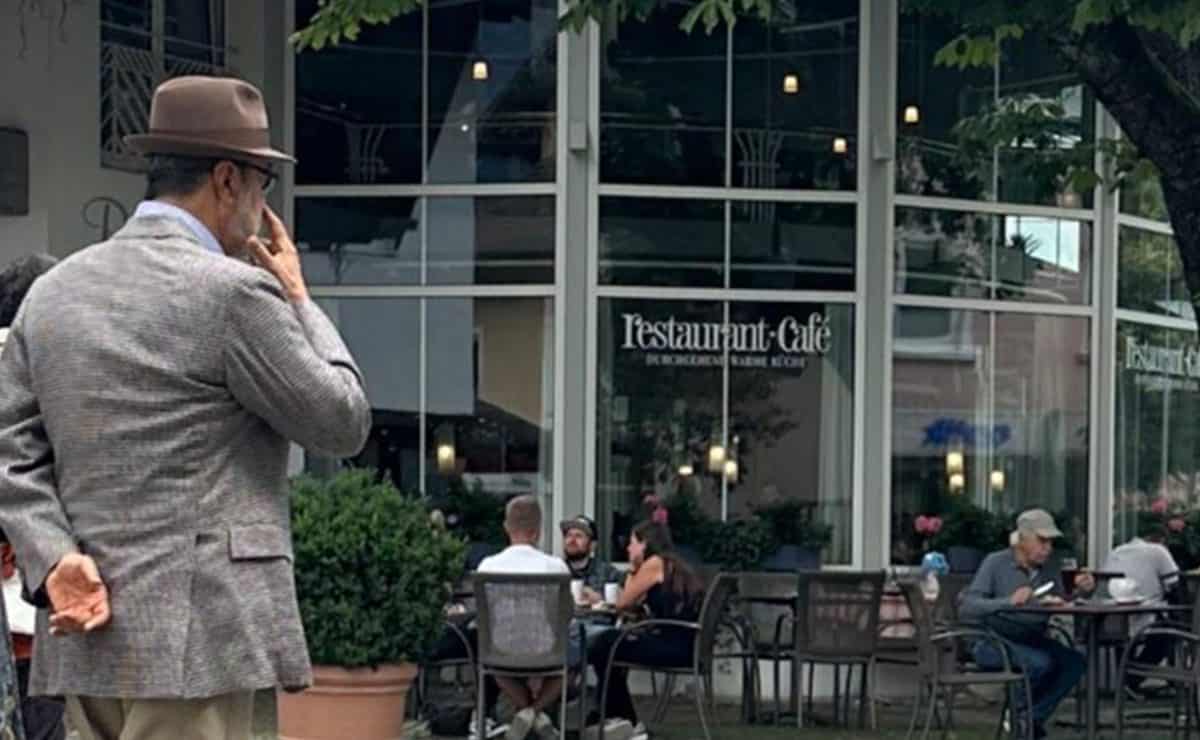 وبدا السلطان هيثم أمام مقهى “restaurant” في برلين، وهو يرتدي البرنيطة الأوروبية ويضع يده اليسرى خلف ظهره.