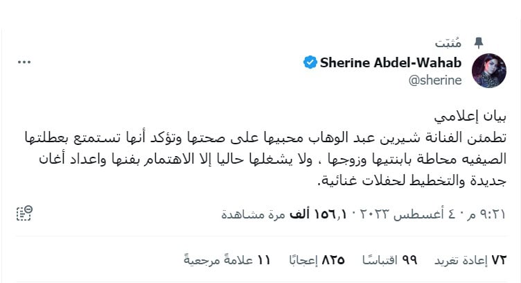 ونشرت شيرين بياناً رسمياً عبر تويتر قالت فيه: “تطمئن الفنانة شيرين عبد الوهاب محبيها على صحتها وتؤكد أنها تستمتع بعطلتها الصيفيه محاطة بابنتيها وزوجها. ولا يشغلها حاليا إلا الاهتمام بفنها واعداد أغان جديدة والتخطيط لحفلات غنائية.”
