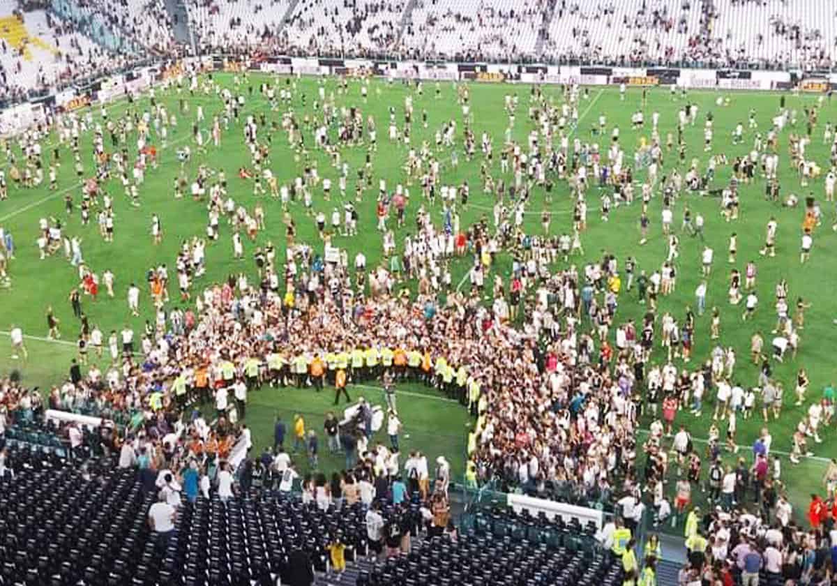وتداول نشطاء مواقع التواصل الاجتماعي، مقطع فيديو يظهر فيه اقتحام جماهير نادي يوفنتوس الإيطالي، عقب نهاية المباراة الودية أمام فريق شباب النادي على ميدان ملعب ( أليانز ستاديوم)، التي شهدت الحضور من قبل الجماهير داخل المدرجات.