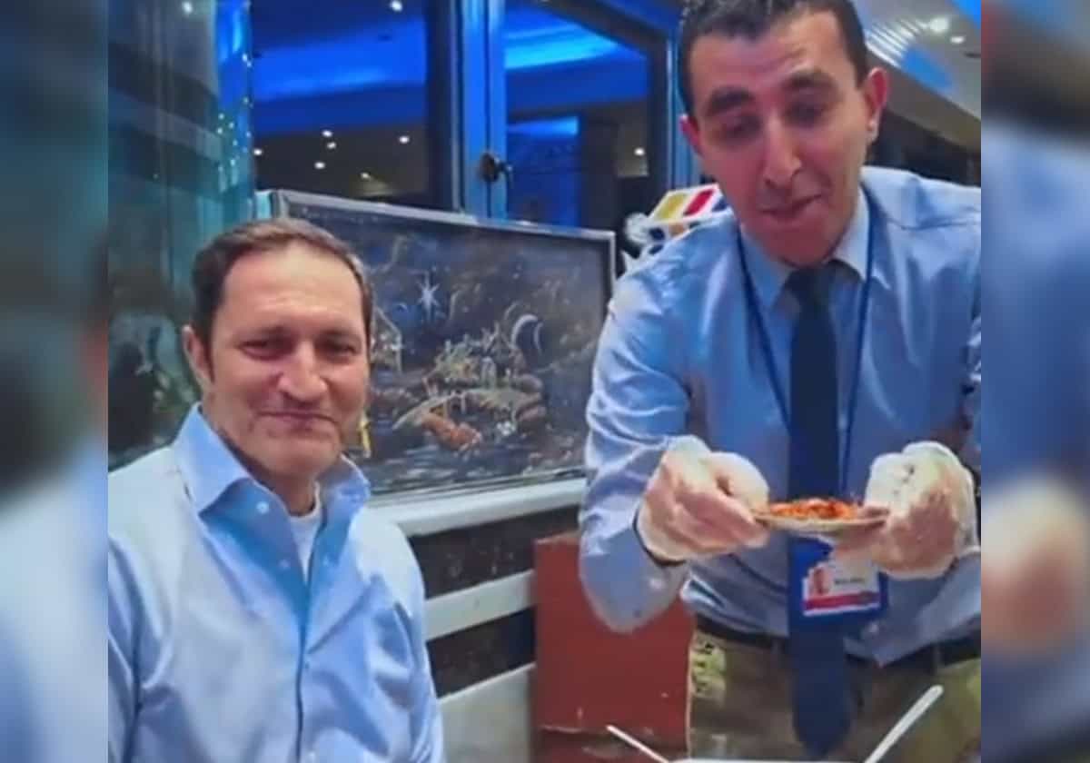 وظهر أحد العاملين في المطعم وهو يقدم الكشري لعلاء مبارك، ويكيل له الثناء والمدح.