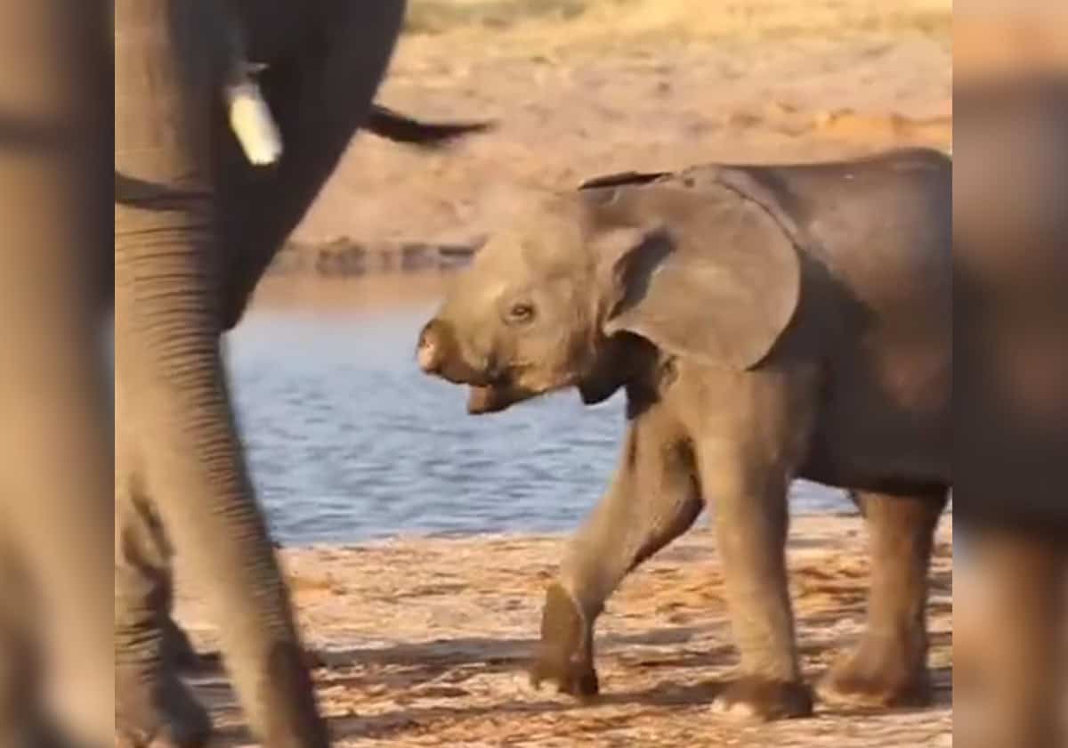 وبدا وهو يحتك بأمه ثم يُرى في مشهد تال وهو يبعثر تراباً تحت قدميه، ثم يقوم بالسير خلف أمه إلى بركة ماء.