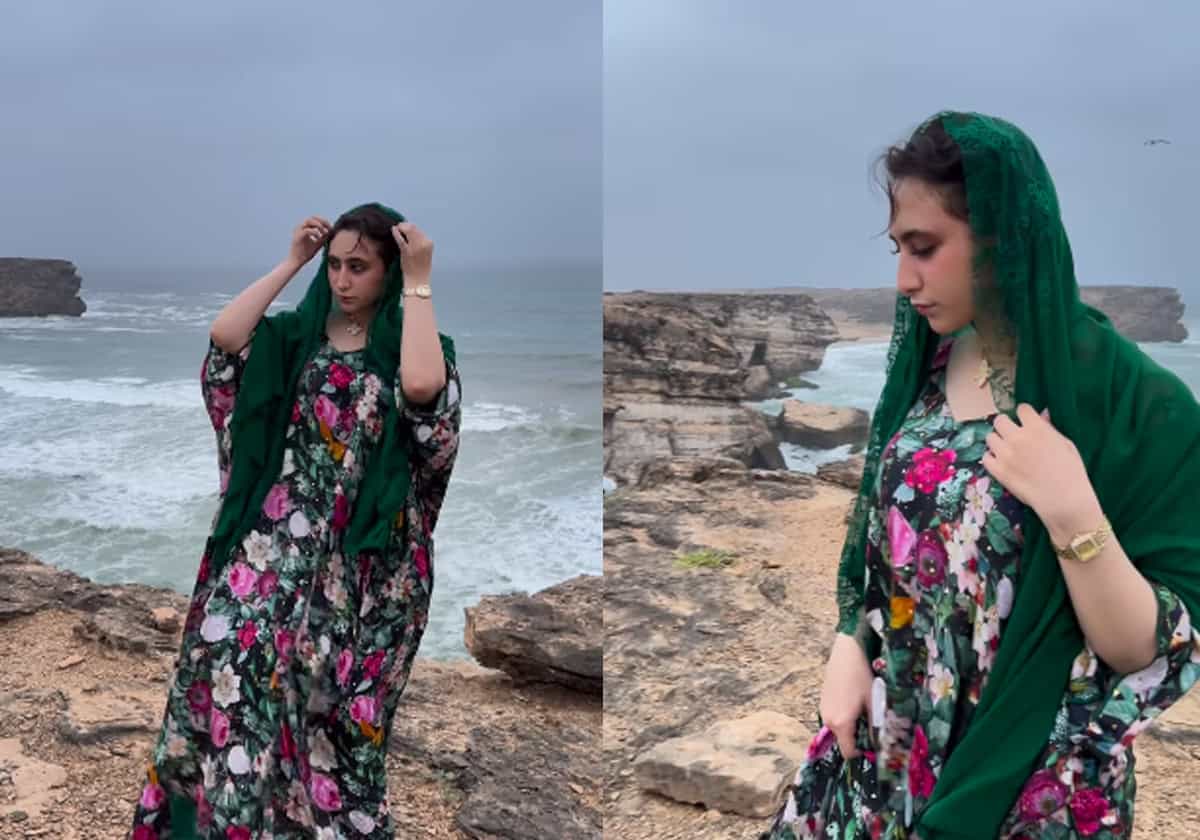 كما أنها نجحت في دمج هذا الفستان بأناقة مع إكسسوارات متناسقة تزيد من جاذبيتها، بينما اختارت الوقوف على بعد أمتار من إحدى شواطئ السلطنة.