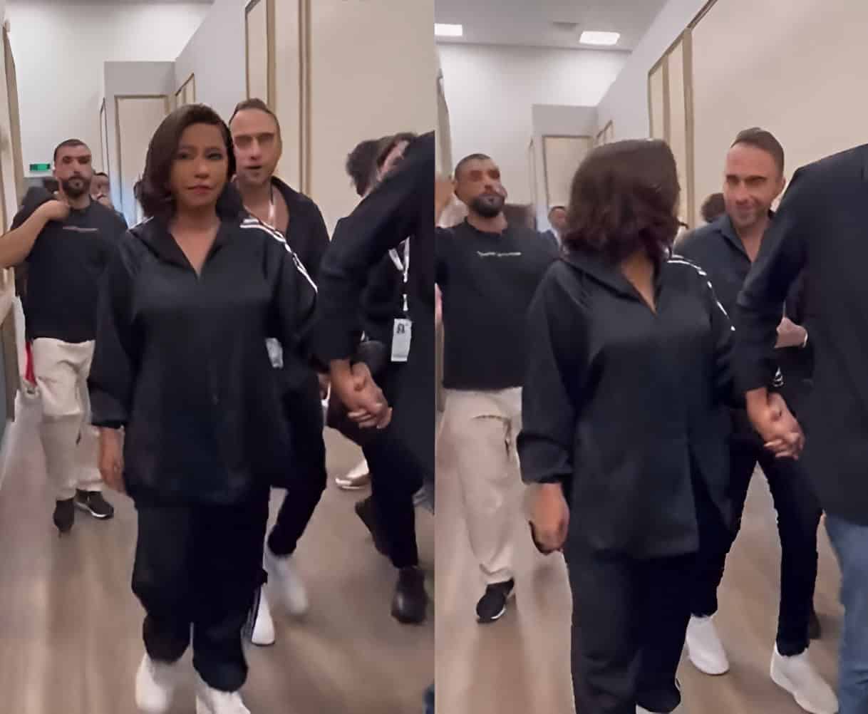 ويبدو أن الغيرة سيطرت على حسام حبيب الذي كان يسير خلف شيرين، فنظر إليها وأشار إلى يدها، في محاولة لإخبارها بأنه منزعج.