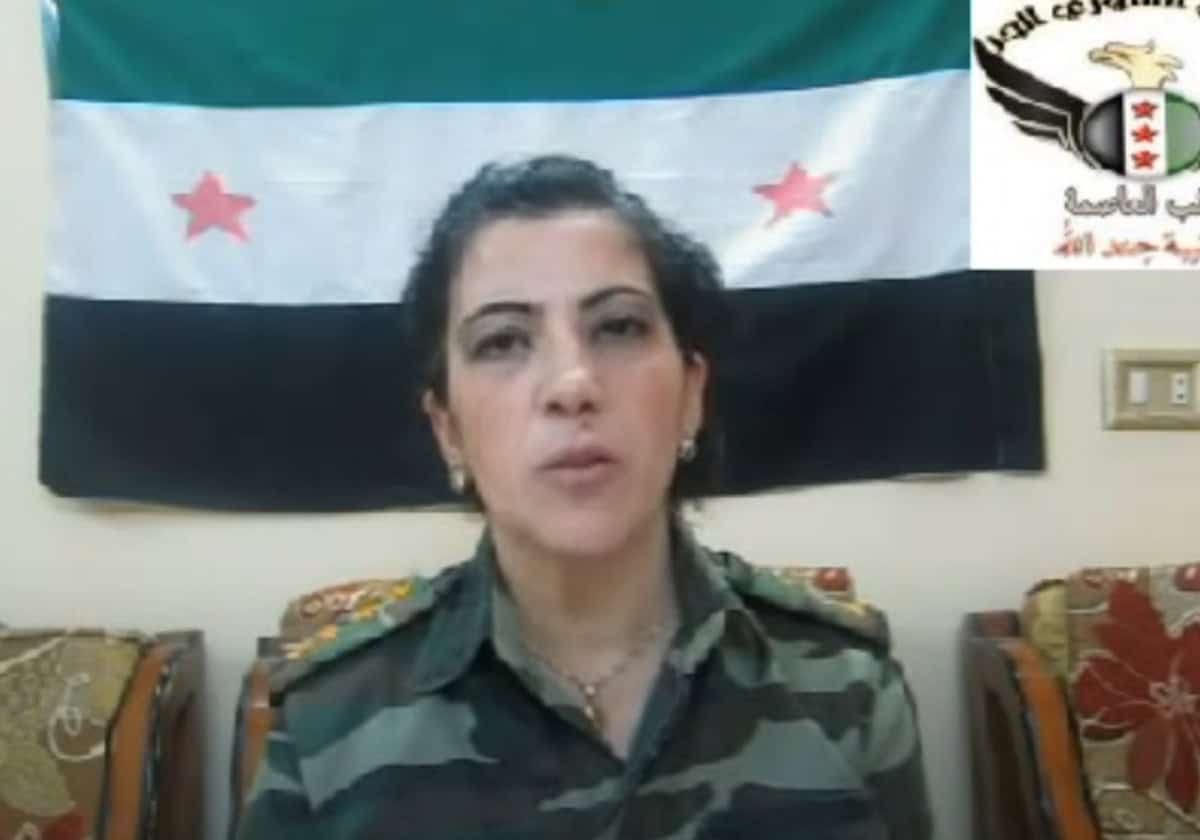 وبحسب “خدمة تقضي صحة الأخبار العربية” يظهر في الفيديو شابّة بلباس عسكريّ، ووراءها علم المعارضة السوريّة.