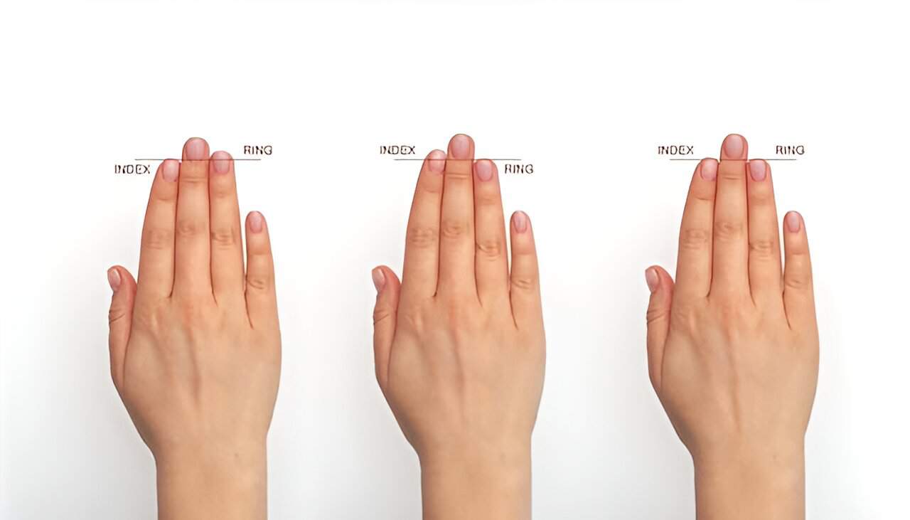 عند الإناث، تكون الأصابع عادةً متساوية تقريبًا في الطول. لكن عند الرجال، يكون الإصبع الرابع (البنصر) عادةً أطول من السبابة.