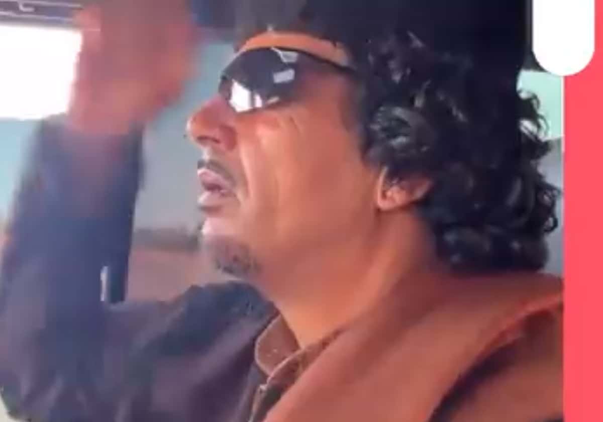 وظهر شبيه القذافي بشعره الكث ونظارته السوداء الشهيرة، داخل سيارة بدت عسكرية وهو يرفع قبضة يده اليمنى على طريقة القذافي، فيما شوهد سيارات مرافقة تحمل العلم الليبي.