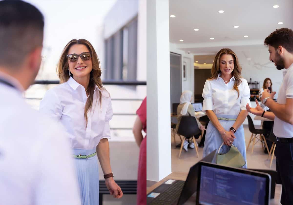 ونسقت الملكة العبدالله مع التنورة بلوزة بيضاء ذات أكمام قصيرة، مع حزام أخضر وحذاء بكعب عال من “جيمي شو” من الجلد الأبيض وحقيبة من ماركة LOEWE.