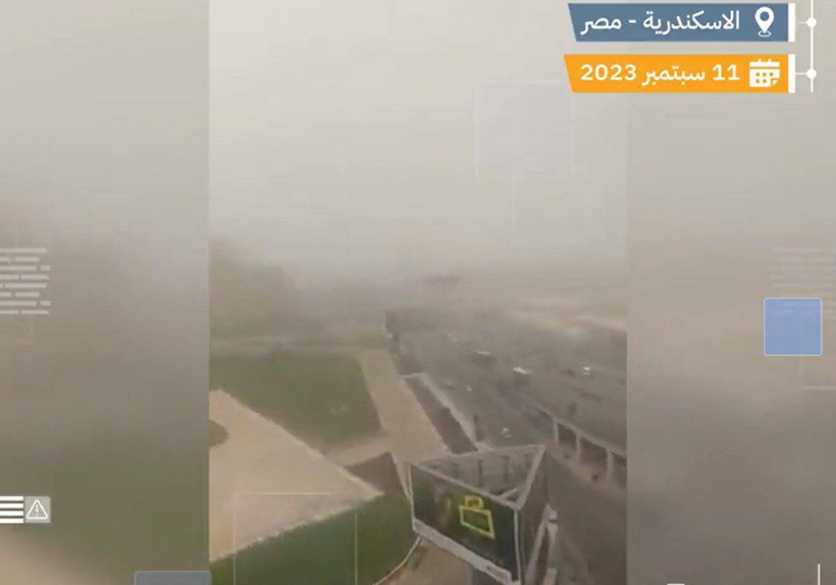 كما انتشرت لقطات عديدة أظهر أجواء ترابية ضبابية ضمن مناطق ضربها الإعصار دانيال الذي يصل مصر قادماً من ليبيا.