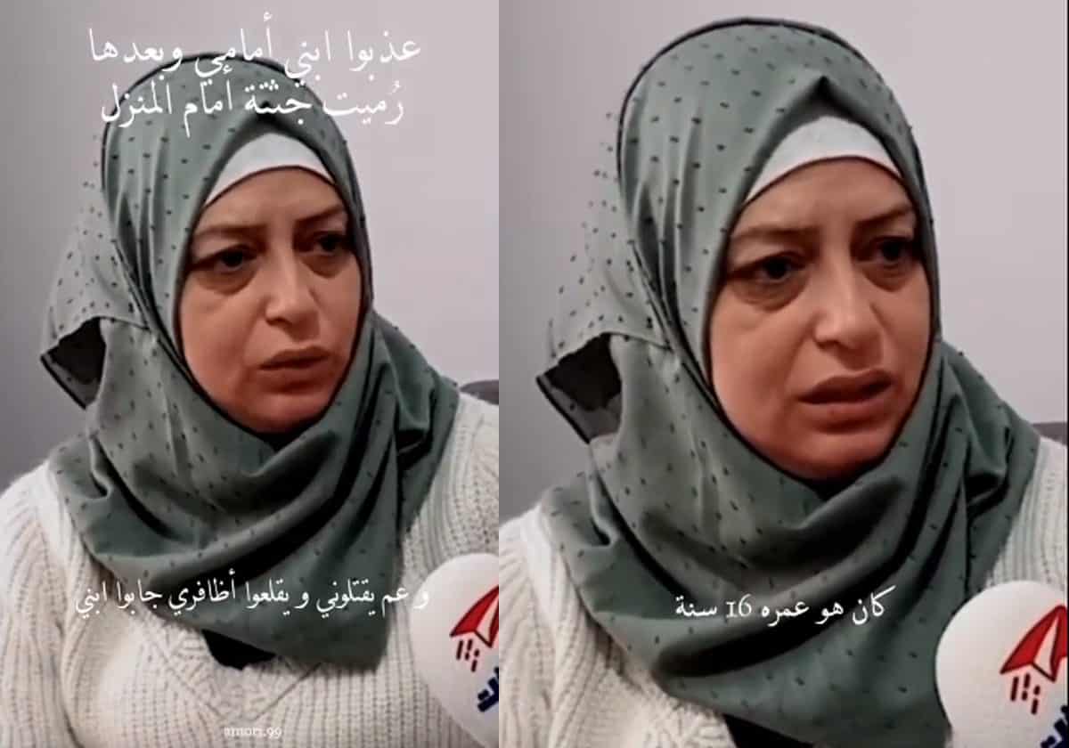 وتابعت: “ابني كان أمامي.. كان عمره 16 سنة، شكله كان ولد صغير.. كأنه عنده 6 سنوات بسبب الضعف والتعذيب”.