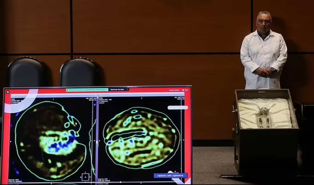 ووقف “خايمي موسان” الذي قاد التحقيقات في الظواهر الفضائية لعقود من الزمن مع علماء للكشف عن جثتين ووصف الحدث بالمهم والفاصل أمام الكونغرس المكسيكي.