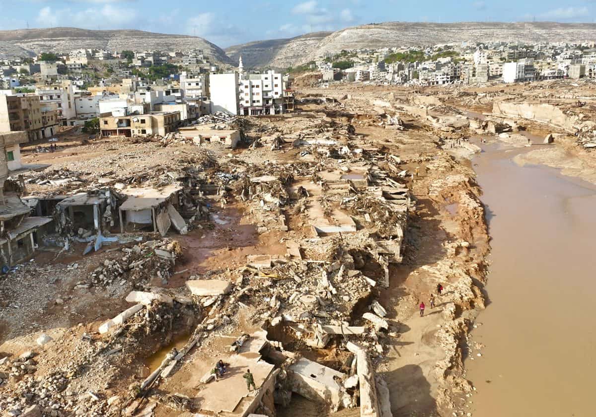 وأسفرت السيول والفيضانات التي ضربت ليبيا، عن اختفاء أحياء وانهيار جسور ودمار واسع في شبكة الطرق لمدينة درنة وجوارها، بينما تكثف فرق البحث والإنقاذ المحلية والأجنبية جهودها للبحث عن ناجين وانتشال ودفن الجثث المتناثرة في المدينة.