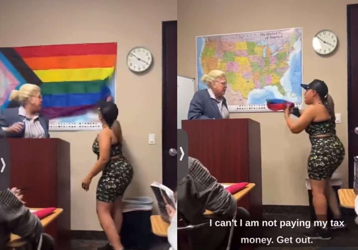 وخلال خطوة أم أمريكية تمزق علم المثليين وبعدما قاطعتها المعلمة: “لماذا تريدين رفع هذا العلم في الفصل لكي يراه الطلاب إنه جزء من تعليم الطلاب” ردت الأم بنبرة عالية: “كلا هذا ليس جزءاً من أي شيء هذا غير مناسب لهم”.