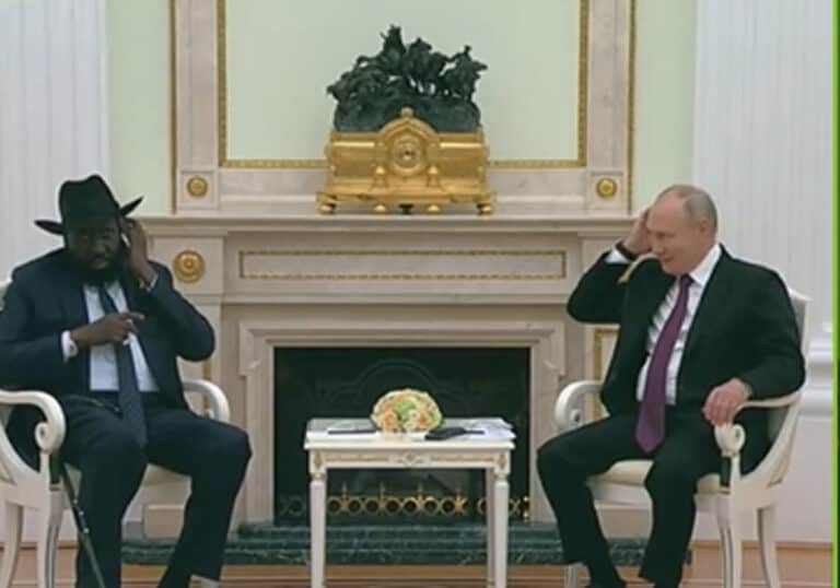 وطن- انتشر مقطع فيديو، يخص جانبا من اللقاء الذي عقده الرئيس الروسي فلاديمير بوتين، ورئيس جنوب السودان سلفا كير، حيث واجه “الأخير” صعوبات في ارتداء سماعة الترجمة خلال اللقاء.