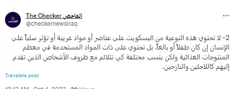 وقالت في تحقيق له نشرته عبر حسابها على منصة “X” (تويتر سابقا) أن “هذا النوع من البسكويت تقوم بتوزيعه منظمة (UNICEF) منذ أكثر من 20 عاماً إلى الآن، ولم تسجل منذ ذلك الحين أي من الحالات التي ذُكرت في الشائعة المتداولة”.