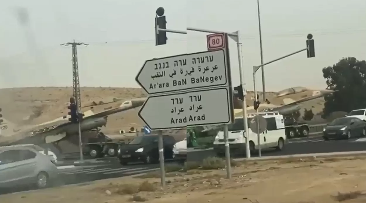 وأظهرت المشاهد مقاتلات إسرائيلية محمولة على ظهر شاحنات ضخمة، خلال عبورها في أحد الطرقات.