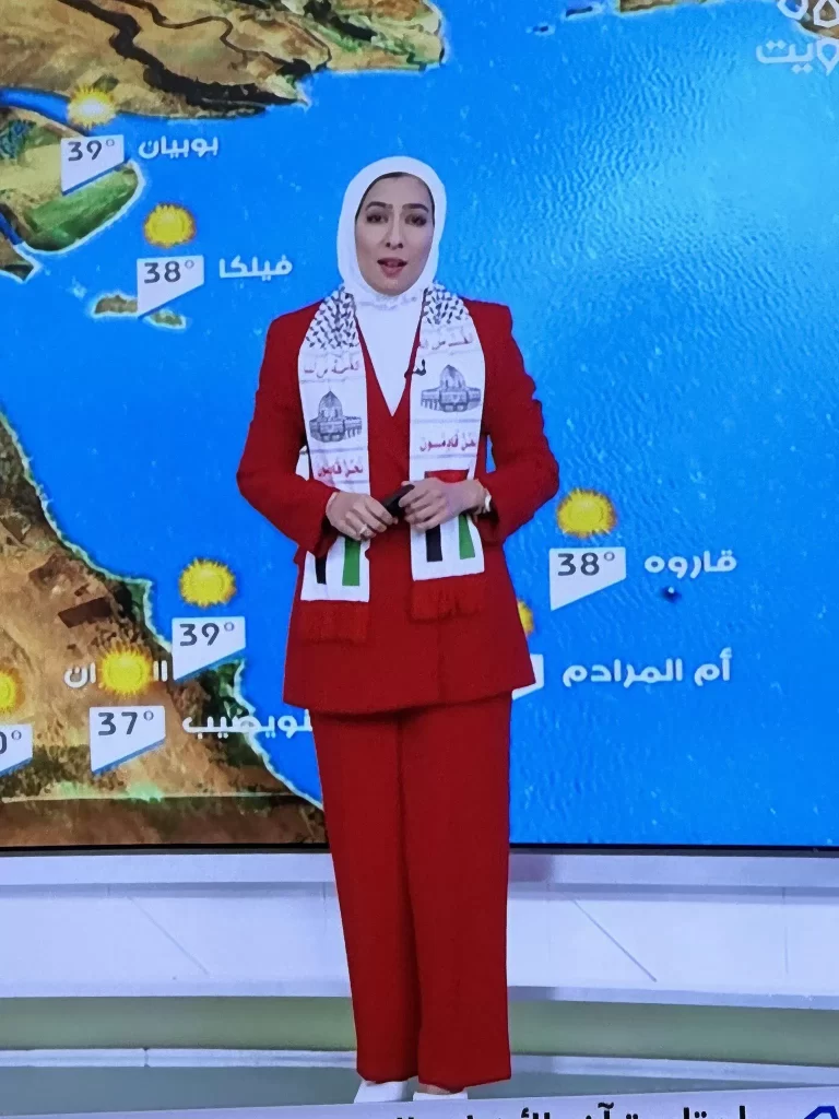 ويأتي ذلك تضامناً من مذيعة الطقس بتلفزيون الكويت، مع الفلسطينيين الذين يواجهون آلة الحرب الإسرائيلية والقصف والدمار عقب عملية طوفان الأقصى التي زلزلت الكيان الإسرائيلي وأثبتت أن أسطورة الجيش الذي لا يقهر مجرد وهم.