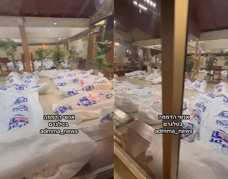 وأظهرت هذه اللقطات، أعدادا كبيرة من جثث قتلى طوفان الأقصى ملقاة أرضا معبأة في أكياس بلاستيكية. وتبين أن الجثث تملأ المكان الموجودة به، في مشهد لم تعرفه إسرائيل منذ عشرات السنوات.