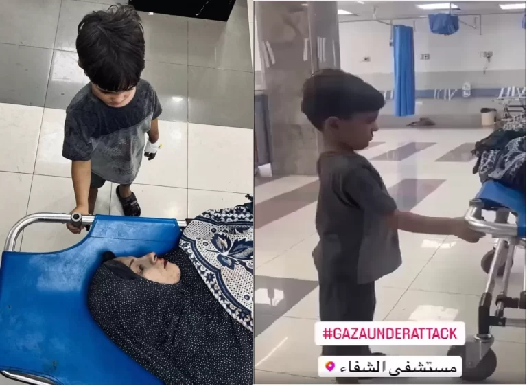 وتداول ناشطون فلسطينيون على مواقع التواصل الاجتماعي مقطع فيديو، يظهر الطفل وهو يقف إلى جانب نقالة تستلقي عليها والدته في بهو مشفى الشفاء بغزة.