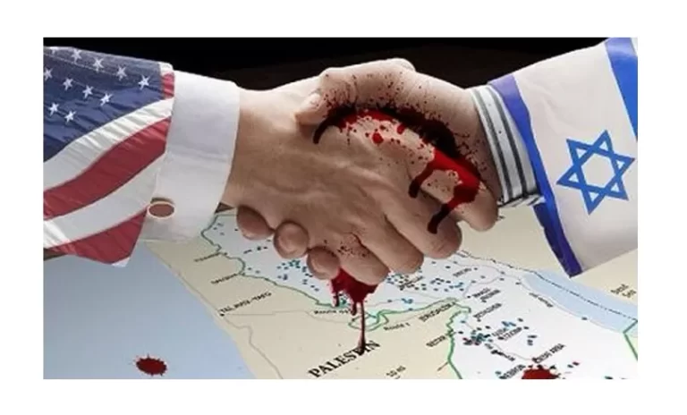 رسما عليهما علم أمريكا وإسرائيل.. يدان ملطختان بدماء تتقاطر فوق خريطة فلسطين